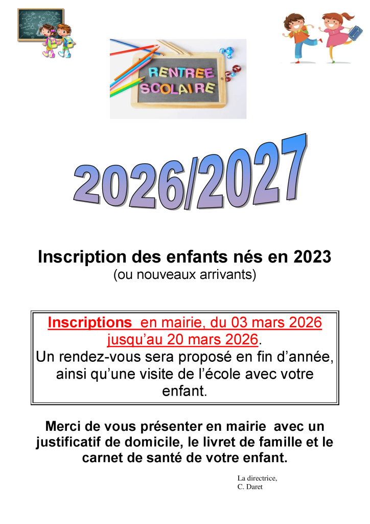 Inscription des enfants nés en 2023 (ou nouveaux arrivants). Inscriptions en mairie du 3 au 20 mars 2026. Se présenter avec…