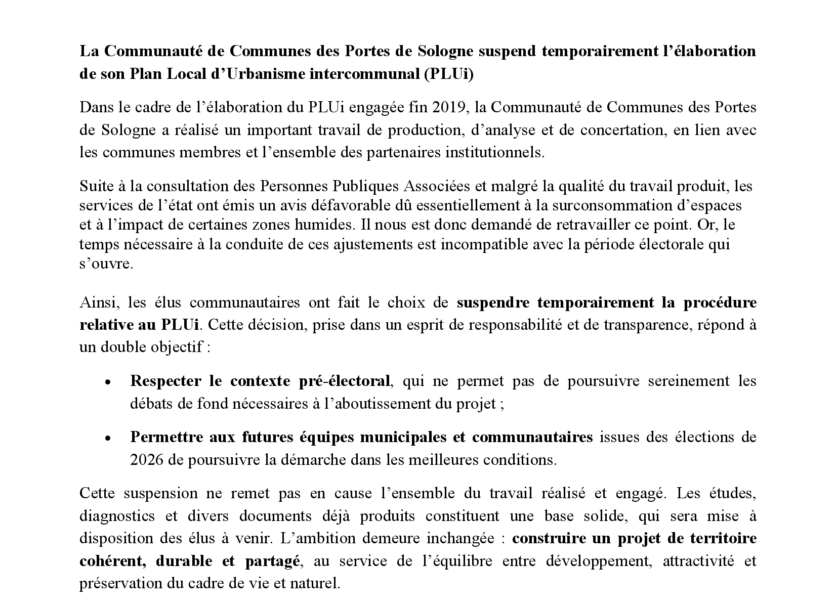 La Communauté de Communes des Portes de Sologne suspend temporairement l’élaboration de son Plan Local d’Urbanisme intercommunal (PLUi)