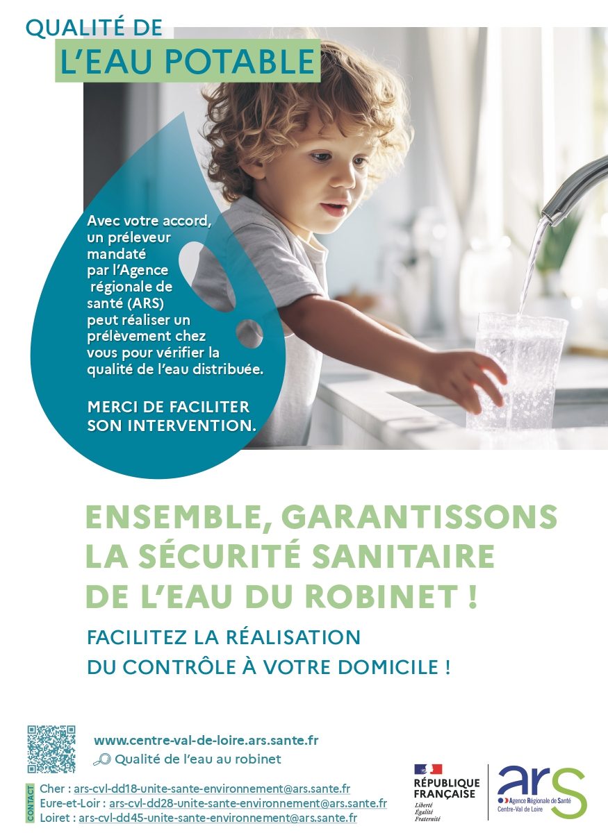 Dans le cadre du contrôle sanitaire de l’eau destinée à la consommation humaine, l’Agence Régionale de la Santé (ARS) Centre-Val de Loire peut être amenée à réaliser des prélèvements d’eau au robinet chez des particuliers, afin de vérifier la qualité de l’eau distribuée.