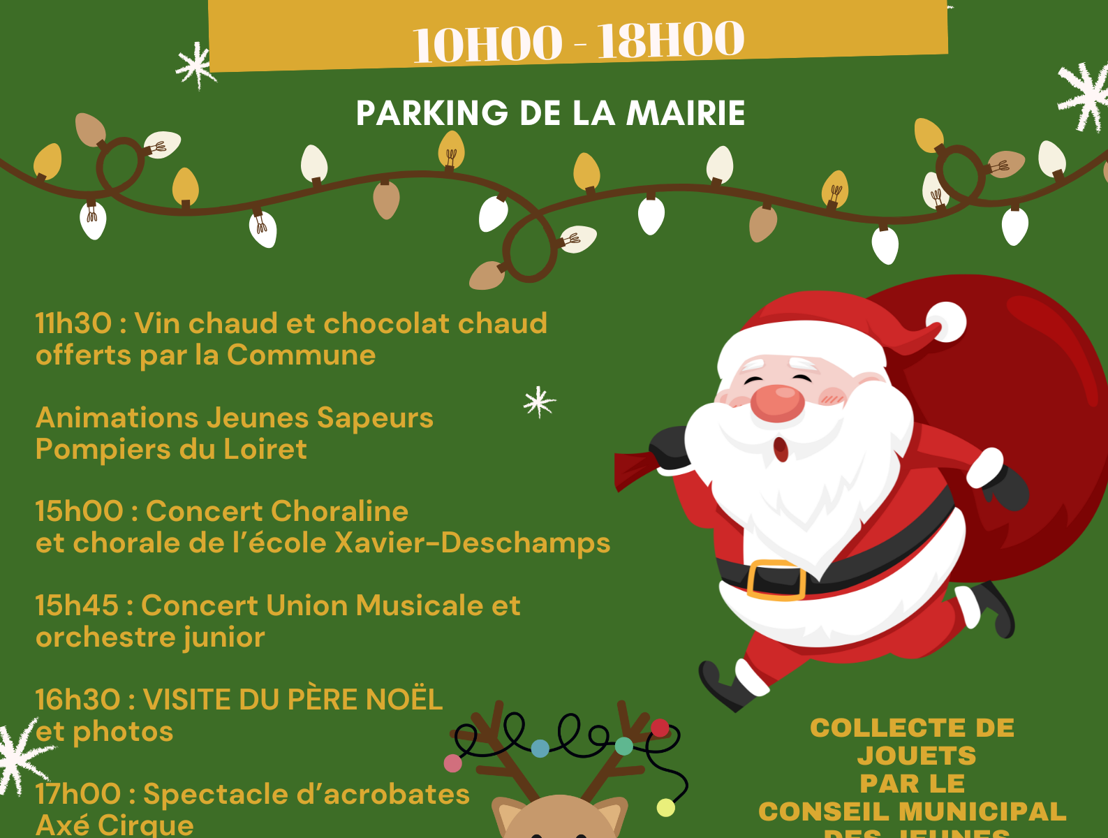 Vin et chocolat chauds offerts aux visiteurs. Animation Jeunes Sapeurs Pompiers du Loiret. Concert Choraline et chorale de l’école Xavier Deschamps. Concert Union Musicale et orchestre junior. Marché de 10h à 18h. Nombreux exposants avec dégustations variées et choix de cadeaux de Noël. Vers 16h30 arrivée du Père Noël avec distribution de friandises aux enfants. Spectacle d’acrobates Axe Cirque