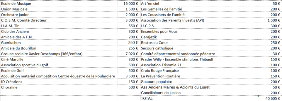40 605€ seront versés à diverses associations dans le cadre de l’exercice en cours. Sont également concernées des associations extérieures à la commune dont les services profitent à certains de nos concitoyens.