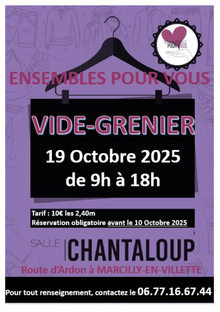 Vide grenier organisé par Ensembles pour vous le 19 octobre 2025 de 9h à 18h à la salle Chantaloup.